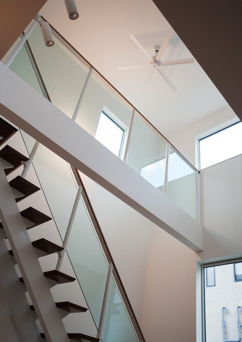 手すりにガラスパネルを採用することで、安全性は確保しながら、より一層の開放感とモダンな印象を加えています。
