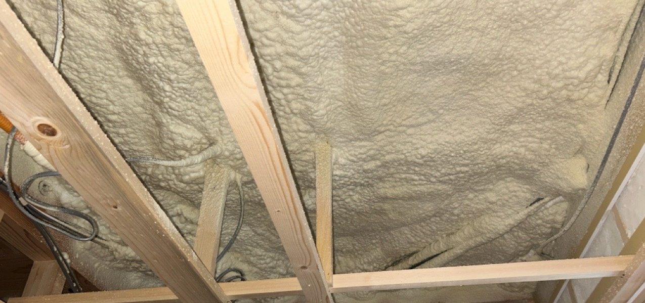 今回の現場では、屋根の勾配に合わせてウレタン断熱材を隅々まで吹き付けています。 現場写真に写るピンは、設計通りの厚みが均一に確保されているかを測定するための目印です。液状から発泡するウレタンは、複雑な隙間にもぴたっと密着するため、高い断熱性能を長期にわたって維持できるのが利点です。