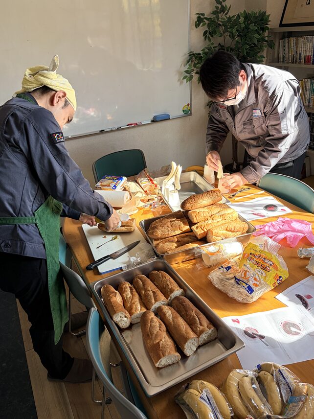 今回の目玉は、外はカリッと、中はジューシーな「特注カスクート」。 会議室に広げられた具材を前に、社員たちが慣れない手つき(?)で一生懸命サンドイッチを作りました。 バターを塗る人、ハムを並べる人……自然と役割分担ができるのも、日頃のチームワークの賜物です。