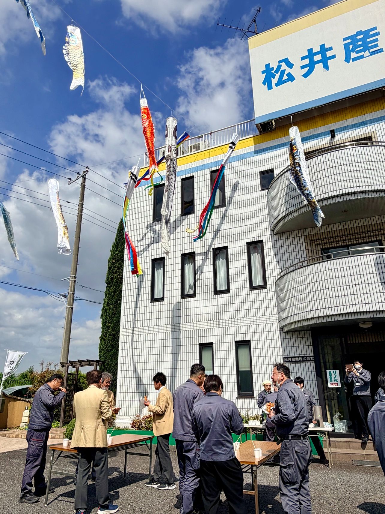 快晴の空の下、社屋の前では大きな鯉のぼりが優雅にダンス。 その下で折り畳みテーブルを囲み、淹れたての飲み物と一緒に手作り朝食を楽しみました。 現場へ向かう前のひととき、肩書きを外して談笑するこの時間が、私たちのパワーの源です。