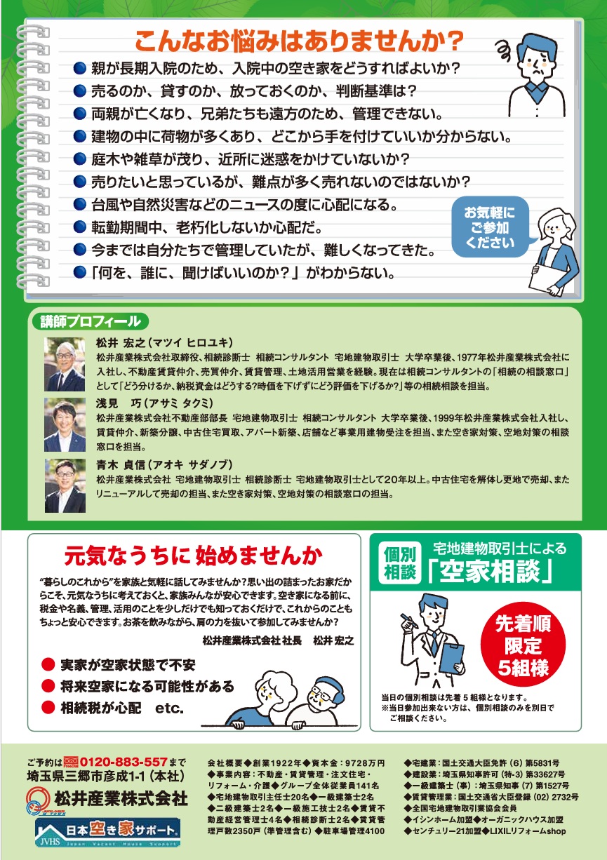 そんな、ふとした瞬間に感じる「お家のこれから」への不安。大切な場所だからこそ、前向きに考えられるきっかけ作りとして、松井産業では「住まいの終活・空き家セミナー」を開催いたします。