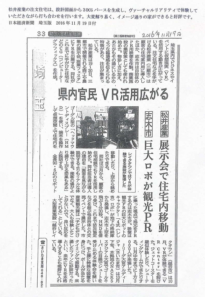 建設・不動産という伝統的な業界において、ICTの導入をいち早く進めたのも松井産業の特徴です。 2016年時点で、日本経済新聞等でも報じられたVR(仮想現実)による住宅内覧システムを稼働。完成前に3D空間を歩き回る体験は、お客様の不安を「納得」へと変える大きな力となりました。
